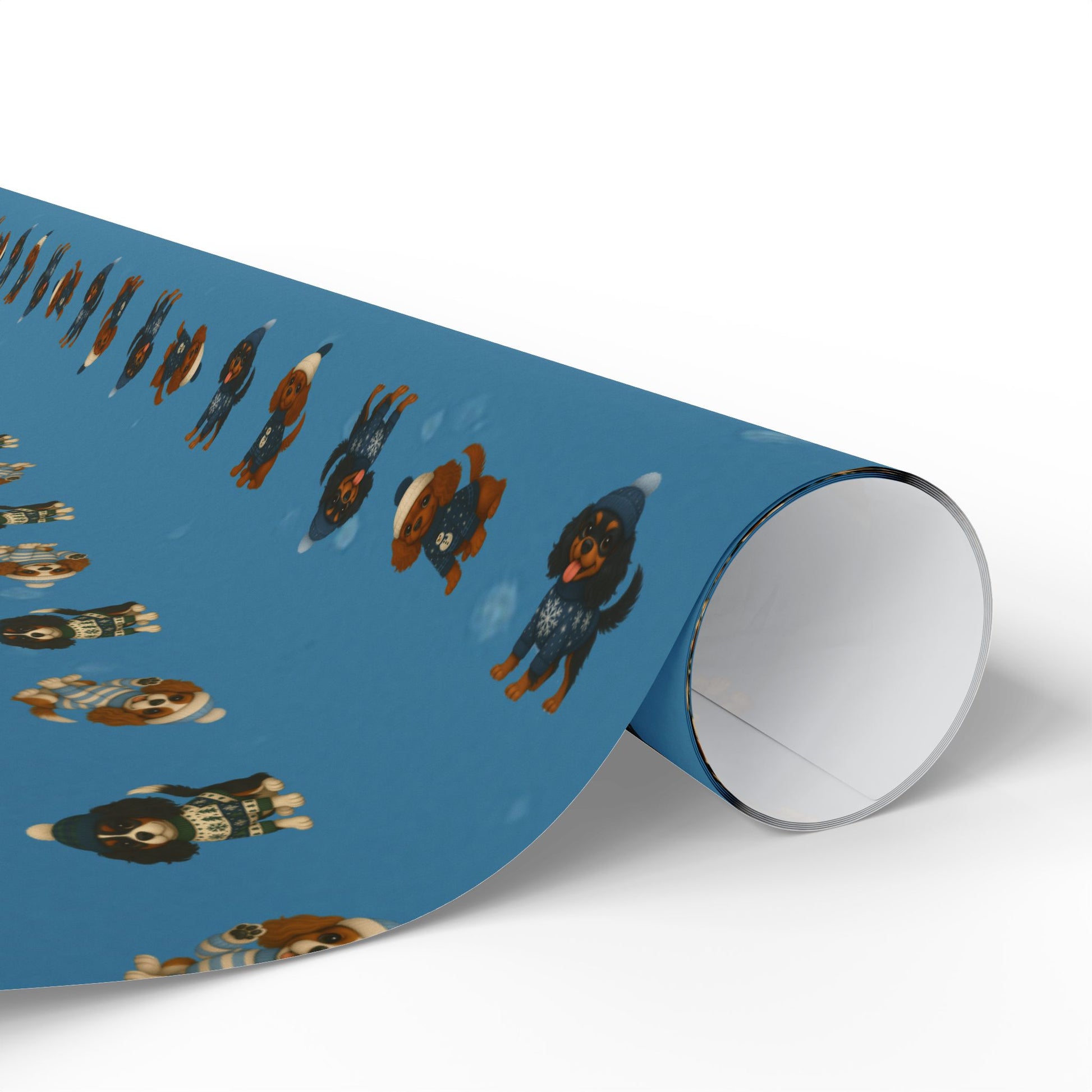 Soft, joyful wrapping paper printed on sturdy 90gsm fine art stock. Tiny, hand-drawn cavalier king charles spaniels march across a dusty blue field, each one sporting a cozy sweater or little accessory, a warm, playful pattern that makes any package feel personal. The print is one-sided with a polished glossy or smooth matte finish, and comes in long, generous rolls so you can wrap gifts for birthdays, winter gatherings, or cozy house visits without seams showing. Subtle white printing edges with a small barcode and QR strip appear at the top and bottom of each roll.